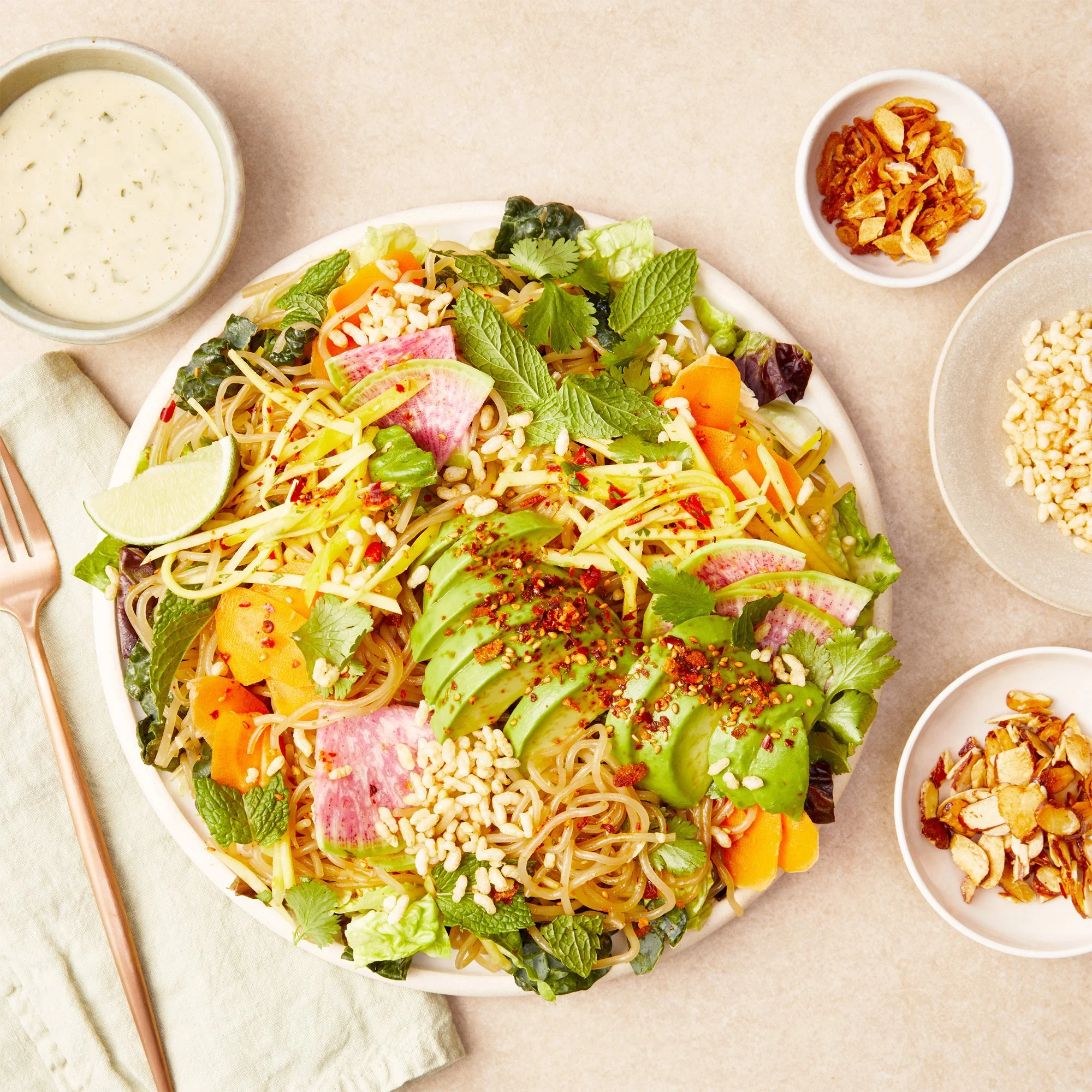 Half crispy, half salad, just the way we like it. Marinated glass noodles, gem lettuce mix, mango slaw, mint and cilantro, avocado, watermelon radish, candied almonds with shallot and garlic blend, crispy Koda Farms rice, and honey lime vinaigrette