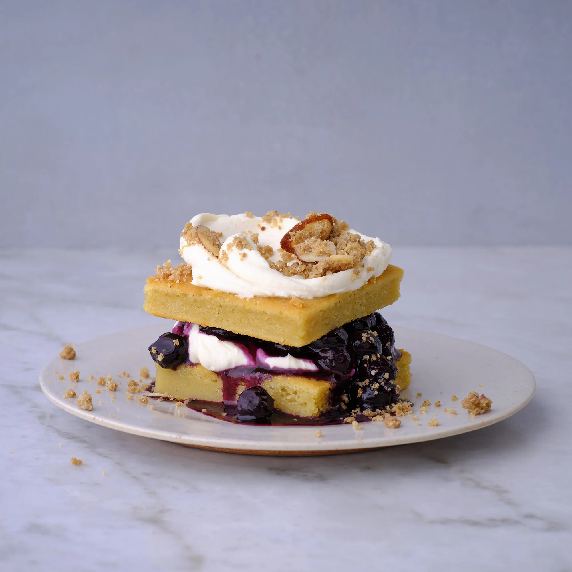 Two layers of bright lemon olive oil cake with blueberry jam and maple cream cheese frosting in the center. Finished with a swirl of maple cream cheese frosting and served with almond streusel to sprinkle on top.