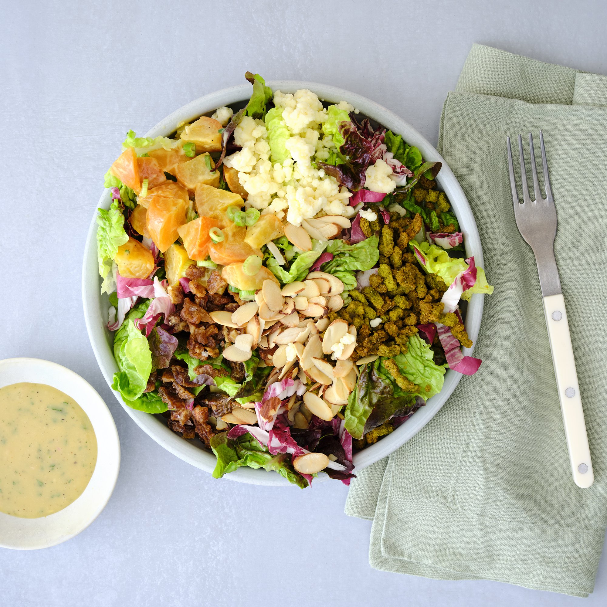 Our fan-favorite chopped salad, back for another season: gem lettuce mix, falafel crispies, Hook's aged 2-year white cheddar, marinated yellow beets, chopped dates, toasted almonds, and a side of maple mustard vinaigrette.