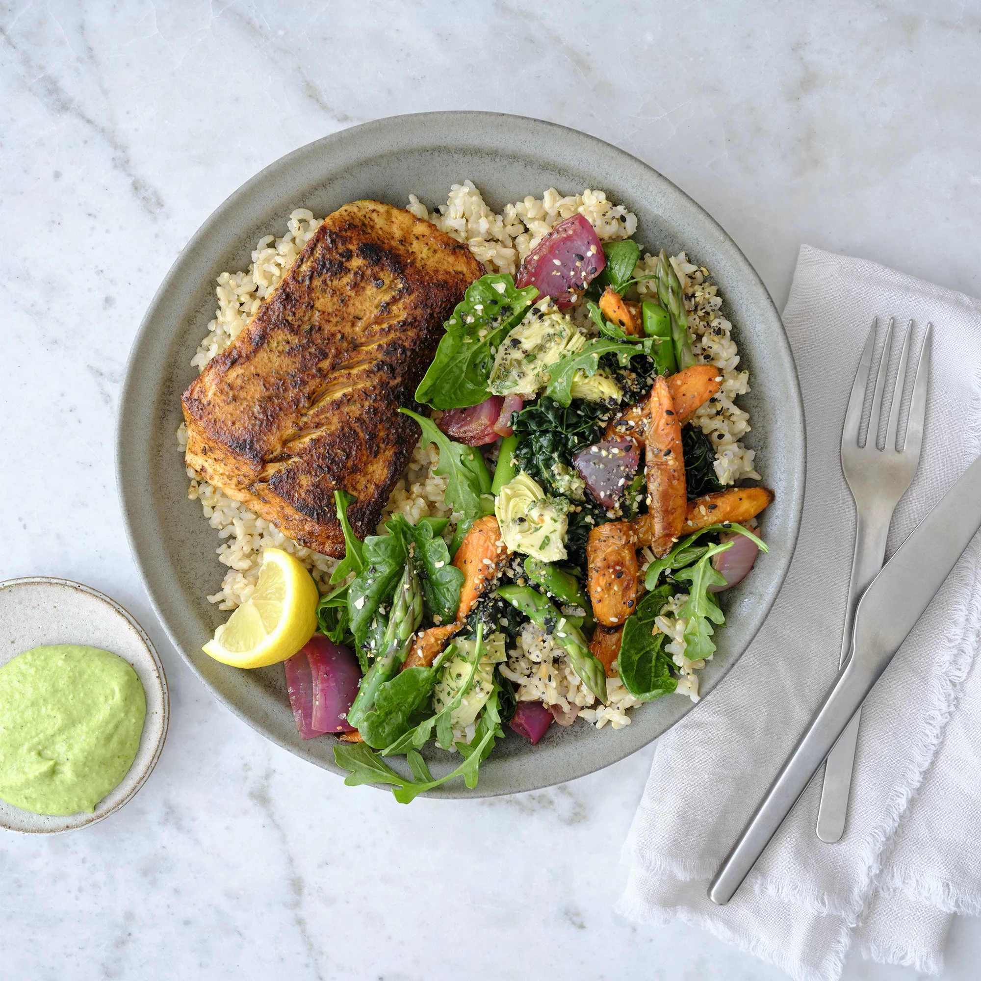 Pan-seared salmon seasoned with our blackening spices, organic brown rice, Spring asparagus, artichokes, grilled red onions, carrots, kale, wilted spinach and arugula blend, lemon wedge, topped with everything- bagel seasoning, and a side of pesto vinaigrette.